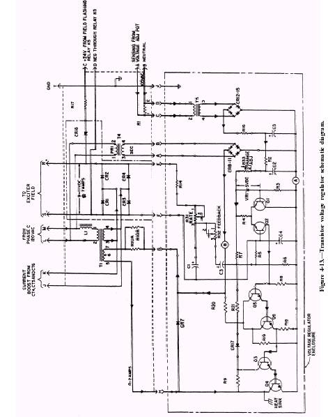 Transistor Voltage Regulator The transistor voltage regulator uses transistor amplifiers to control a saturable core transformer that regulates field excitation. The circuitry also includes a power supply, error detection and amplifier circuit, stability circuit, crosscurrent compensation circuit, and a field flash circuit. A transistor voltage regulator circuit is shown in figure 4-13. The assembly operates as follows: 1. The regulated exciter field voltage at terminals S and R is obtained by saturable core transformer T1. The inductance of this transformer can be varied with the control winding 5-7 so that the voltage ratio between windings 1-2 and 3-4 may be increased or decreased in proportion to the direct current flowing in winding 5-7. When the magnitude of