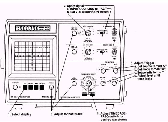 Front Panel Controls The fastest way to become familiar with the oscilloscope is to use the same procedure to set up every waveform. The front panel has all of the controls grouped by function to allow you to move clockwise around the panel as you apply the signals, adjust the trigger circuits, and then adjust the horizontal sweep circuits. Always start from the same point when you apply a new signal or experience difficulty in locking the waveform. Use the following procedures as a checklist to follow as you learn how to operate the oscilloscope. Each of these simplified procedures is covered in detail in the operator's manual. Be sure to read your manual to understand fully the effect each control has on the waveform. To set up any waveform, refer to figure 4-27 and perform the following steps: 1. Select the desired CRT display button to produce a single-trace, dual-trace, or vector display.
