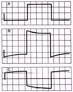Test Probe Frequency Compensation Each test probe has a special compensation capacitor built into the BNC connector body. This capacitor matches the capacity of the probe and connecting cable to the input of the oscilloscope for flat frequency response. An uncompensated probe may result in waveform distortion or incorrect amplitude readings. The compensation affects both the CRT display and the digital peakto-peak function. Check the probe's compensation by connecting it to the PROBE COMP jack on the front panel. The resulting CRT display (fig. 4-28) should have a flat top and bottom with square corners (view A). Overshoot (view B) or rounding (view C) indicates the capacitor in the probe needs adjustment. Perform this adjustment as specified in the operator's manual.