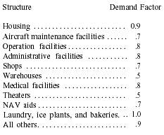 Power and Voltage Requirements The selection of voltage is affected by the size, character, and distribution of the load; length, capacity, and type of transmission and distribution circuits; and size, location; and connection of generators. Practically all general-purpose lighting in the United States and at United States overseas bases is 120 volts. The lighting voltage may be obtained from a three-wire, 120/240-volt, single-phase circuit or a 120/208-volt, three-phase, four-wire circuit. Some small motors can be supplied by direct current (dc) or single-phase ac at nominally 120 volts. Large three-phase, ac motors above 5 horsepower generally operate satisfactorily at any voltage between 200 and 240. The general use of combined light and power circuits increases the use of 240 and 208 volts for general power application. Computation of the Load As mentioned earlier in this chapter, there are various factors that must be taken into consideration in the selection of the required generating equipment. The following technical data will help you in computing the load. Before any part of the system can be designed, the amount of power to be transmitted, or the electrical load, must be determined. Electrical loads are generally measured in terms of amperes, kilowatts, or kilovolt-amperes. In general, electrical loads are seldom constant for any appreciable time but fluctuate constantly. In calculating the electrical load, you must determine the connected load first. The connected load is the sum of the rated capacities of all electrical appliances, lamps, motors, and so on, connected to the wiring of the system. The maximum demand load is the greatest value of all connected loads that are in operation over a specified period of time. Knowledge of the maximum demand of groups of loads is of great importance because it is the group maximum demand that determines the sizes of conductors and apparatus throughout the electrical system. The ratio between the actual maximum demand and the connected load is called the DEMAND FACTOR. If a group of loads were all connected to the supply source and drew their rated loads at the same time, the demand factor would be 1.00. There are two main reasons why the demand factor is usually less than 1.00. First, all load devices are seldom in use at the same time and, even if they are, they will seldom reach