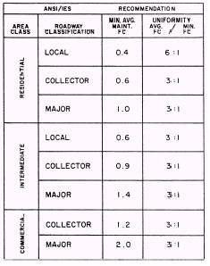 STREETLIGHTING Streetlighting at naval facilities usually need not produce as high a level of illumination as that required in many municipal areas. Because night activity by vehicles and pedestrians is low, only enough light is supplied to permit personnel to identify streets and buildings and to furnish sufficient visibility for local security requirements. The streetlighting equipment used need not be as attractive as that frequently installed in municipal systems. It should be functional and of good quality. These factors permit economical streetlighting installations. STREET AND AREA CLASSIFICATION Streetlighting requirements generally consist of a minimum average maintained footcandle level and a maximum allowable uniformity ratio for the installation. The authority for these requirements is the American National Standards Institute (ANSI)/Illumination Engineering Society (IES) publication, Standard Practice for Roadway Lighting. Another publication which may prove helpful is Informational Guide for Roadway Lighting, published by the American Association of State Highway and Transportation Officials. The only significant difference between the two publications is that the latter allows a 4 to 1 uniformity ratio instead of the 3 to 1 uniformity ratio specified by IES. These uniformity ratios are defined as the ratio of the average footcandle value divided by the minimum footcandle value. LIGHTING INTENSITY The illumination and uniformity requirements are given in table 1-2. Note that the illumination level is dependent upon the roadway classification and the area classification, which are defined in the following material. Streets are classified into three major categories: major, collector, and local. Major: The part of the roadway system that serves as the principal network for through traffic flow. The routes connect areas of principal traffic generation and important rural highways entering the city. Collector: The distributor and collector roadwag traffic between major and local roadways. These are roadways used mainly for traffic movements within residential, commercial, and industrial areas. Local: Roadways used primarily for direct access to residential, commercial, industrial, or other abutting property. They do not include roadways carrying through traffic. The locality or area is also defined by three major categories: commercial, intermediate, and residential. Commercial: That portion of a municipality in a business development where ordinarily there are large numbers of pedestrians and a heavy demand for parking space during periods of peak traffic or a sustained high pedestrian volume and a continuously heavy demand for off-street parking during business hours. Intermediate: That portion of a municipality ide of a downtown area but which is outs generally within the zone of influence of a business or industrial development, characterized often by a moderately heavy nighttime pedestrian traffic and a somewhat lower parking turnover than is found in a commercial area. This definition includes military installations, hospitals, and neighborhood recreational centers. Residential: A residential development, or a mixture of residential and commercial establishments,- characterized by few pedestrians and a lower parking demand or turnover at night. This definition includes areas with single family homes and apartments. |