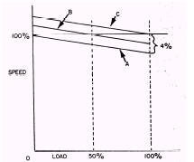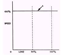 Parallel Plant Operation If the load of a single generator becomes so large that its rating is exceeded, it becomes necessary to add another generator in parallel to increase the power available for the generating station. Before two ac generators can be paralleled, the following conditions have to be fulfilled: 1. Their terminal voltages have to be equal. 2. Their frequencies have to be equal. 3. Their voltages have to be in phase. When two generators are operating so that the requirements are satisfied, they are said to be in synchronism. The operation of getting the machines into synchronism is called synchronizing. Generating plants may be operated in parallel on an isolated bus (two or more generators supplying camp or base load) or on an infinite bus (one or more generators paralleled to a utility grid). One of the primary considerations in paralleling generator sets is achieving the proper division of load. This can be accomplished by providing the governor of the generator with speed droop. This would result in a regulation of the system. The relationship of REGULATION to LOAD DIVISION is best explained by referring to a speed versus load curve of the governor. For simplicity, we will refer to the normal speed as 100 percent speed and full load as 100 percent load. In the controlled system, we will be concerned with two types of governor operations: isochronous and speed droop. The operation of the isochronous governor (0 percent speed droop) can be explained by comparing speed versus load, as shown in figure 5-6. If the governor were set to maintain the speed represented by line A and connected to an increasing isolated load, the speed would remain constant. The isochronous governor will maintain the desired output frequency regardless of load changes if the capacity of the engine is not exceeded. The speed droop governor (100 percent speed droop) has a similar set of curves, but they are slanted, as shown in figure 5-7. If a speed droop governor were connected to an increasing isolated load, the speed would drop (line A, fig. 5-7) until maximum engine capacity is reached. Now let's imagine that we connect the speed droop governor (slave machine) to a utility bus so large that our engine cannot change the bus frequency (an infinite bus). Remember that the speed of the engine is no longer determined by the speed setting but by the frequency of the