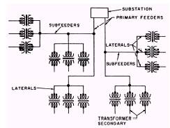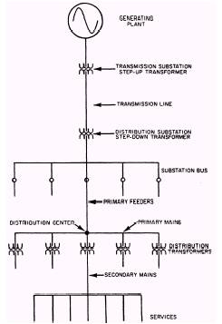 Figure 5-8.\Elements of a power distribution system. power to the proper voltage and frequency necessary for transmission. Usually, a substation is used to connect the generating plant to the transmission lines. The substation transforms the generated voltage to transmission voltage and protects the generating plant against any faults on the transmission lines. Another substation is used to transform the transmission voltage to that of the distribution voltage. The distribution substation protects the substation and transmission lines against any faults occurring on the distribution feeders. At many advanced bases, the source of the power will be generators connected directly to distribution centers, thus eliminating the need for substations. Primary feeders are those conductors in a distribution system that are connected from the substations and that transfer the power to the distribution centers (fig. 5-8). They may be arranged as radial, loop, or network systems and may be overhead or underground. Radial Distribution System A representative schematic of a radial distribution system is shown in figure 5-9. You will note the branching out of the independent feeders to several distribution centers without intermediate connections between feeders. The most frequently used system is the radial distribution system because it is the simplest and least expensive system to build. It is not as reliable as most systems, however, because a fault in the main feeder may result in an outage on all loads served by the feeder. Service on this type of feeder can be improved by installing automatic circuit breakers that will reclose the service at predetermined intervals. If the fault continues after a predetermined number of closures, the breaker will be locked out until the fault is cleared and service is restored by hand reset. Loop, or Ring, Distribution System The loop (or ring) system of distribution starts at the substation and is connected to or encircles an area serving one or more distribution transformers or load centers; the conductors of the system return to the same substation.