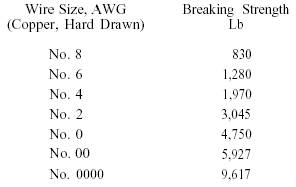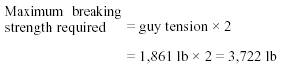 to the right until you reach the column under 30, the number of feet the anchor is away from the pole. The figure shown (1.41) is the guy ratio multiplier. Now let's compute the guy tensioning value. Example: Total side pull guy ratio multiplier 1,320 1.41 = 1,861 lb The guy wire and anchor for this example must be rated to hold at least 1,861 foot-pounds of load. Guy wire comes in various sizes and grades from 1/4 to 1/2 inch. Table 5-8 lists the grades and sizes in the left-hand column with the breaking and allowable tension strengths in the right columns. To determine the correct grade and size of guy wire, first multiply the calculated guy tension by the safety factor of 2. Continuing with our example, solve for maximum breaking strength. Example:
