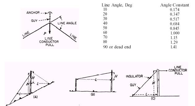 common size of line conductors (hard-drawn copper) that you will encounter in the field. To determine the conductor tension under maximum loading conditions, take 50 percent or one-half of the breaking strength of the conductor. This allows for the safety factor of two required by the National Electric Safety Code. Example: Line tension = 50 percent of breaking strength For No. 6 copper = 50 percent of 1,280 = 640 lb Next, we must determine the angle of change in the line. Any change in the direction of the line increases the line conductor tension and, left uncorrected, tends to pull the pole out of alignment. Table 5-6 lists the most common line angles in degrees and the constant by which the line tension must be multiplied to determine the side pull. Example: For No. 6 copper conductor, for a 30-degree angle, 640 0.517 = 330 lb The total side pull can now be determined by multiplying the side pull of one conductor by the number of conductors. Example: On the basis of four conductors, the total side pull is as follows: 330 4 = 1,320 lb The next step required to determine the correct guy tension is to find the multiplying factor for the lead-to-height ratio. The lead-to-height ratio is the relationship of the lead (L) (distance between the base of the pole and the anchor rod) to the height (H) of the guy attachment on the pole, as shown in figure 5-16. This ratio will vary because the terrain of obstructions will restrict the location of the anchor. A guy ratio of 1 to 1 is preferred. Shortening L increases the tension in the guy, causing increased stresses on the pole especially at dead ends and acute angles. Using our previous example of four No. 6 AWG copper conductors at a 30-degree angle, let's determine the total guy tension using a 1-to-1 ratio, assuming that H = 30 feet and L = 30 feet (refer to table 5-7). Locate the height of the guy attachment (30 ft) in the left-hand column. Move Table 5-6.\Angle Constant Based on Line Angle