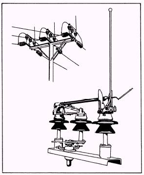 Overcurrent protection and personnel safety requirements are provided for in a power distribution system by the use of air-break switches and fused cutouts. Pole-mounted oil switches may also be used. Lightning arresters protect the primary lines from overvoltage caused by lightning. Switches and Fused Cutouts The air-break switch has both blade and stationary contact equipped with arcing horns, as shown in figure 5-17. These horns are pieces of