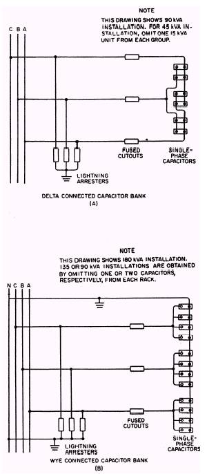 Lightning Arresters The purpose of a lightning arrester installed on primary lines is twofold: first, to provide a point in the circuit at which the lightning impulse can pass to earth without injuring line insulators, transformers, or other connected equipment; and second, to prevent any follow-up power current from flowing to ground. Lightning arresters must be installed on the primary side of all substations, distribution centers, distribution transformers, and capacitor banks. Ground Wire A ground wire on an overhead line may be a galvanized steel, copper-covered steel, or aluminum-covered steel cable. It is strung along the transmission line but is mounted above the other conductors. The ground wire is not a part of any electrical circuit, but is, instead, connected to earth ground at frequent intervals (usually every fifth pole) on pole lines. The ground or earth potential is brought above the transmission lines, therefore reducing the stress placed on the lines and insulators caused by lightning. The effectiveness of a ground wire depends on low ground resistance. Good ground connections should be made at frequent intervals along the line; CAPACITOR BANKS Capacitors are an important part of the distribution system. They provide a convenient and practical means of improving the power factor by neutralizing the effect of lagging power factor loads. This action reduces the line current and line losses and improves the line voltage regulation. Capacitors can be installed in relatively small banks and placed in the circuit near the source of the reactive load or on the primary feeders. Be sure to use high-voltage capacitors when you place capacitors between the transformer and the high-voltage primary lines. Typical capacitor bank connections are shown in figure 5-18. The questions you should now be asking yourself are, How much capacity do I add to the circuit? and How do I go about computing the required capacity with the information I now have available to me? Perhaps the following illustration will help.