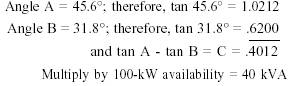 Assume you have a 100-kilowatt supply. You have determined by various measurements that it is operating at 70-percent power factor (PF). You would like to improve the PF to 85 percent. How much capacity should you add? Refer to figure 5-19 and the following calculations. Given: cos A = .70 = present PF cos B = .85 = desired PF From the cosines given above and trigonometric tables, you can determine the following angles and tangents: