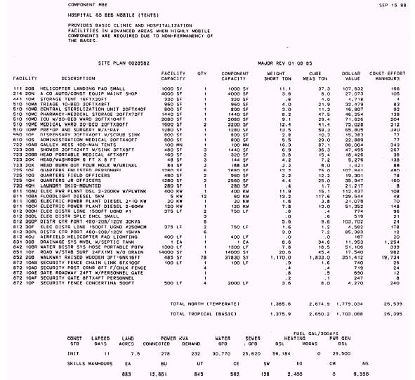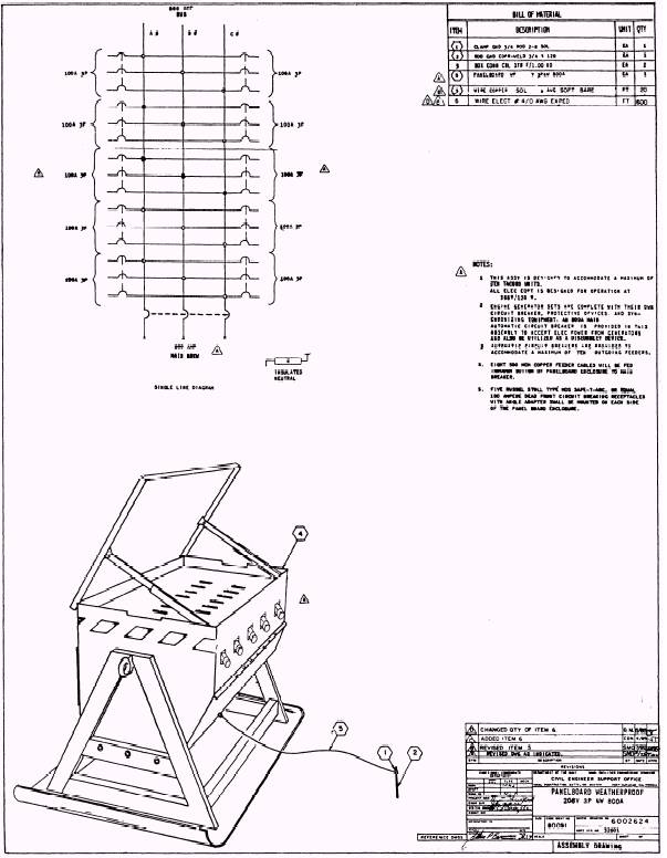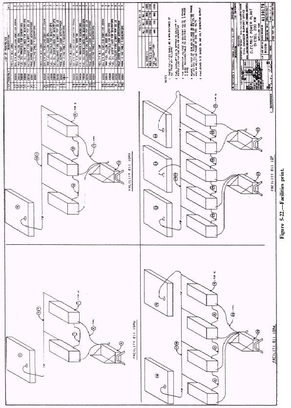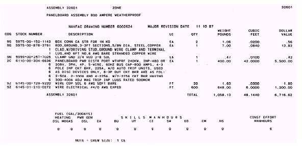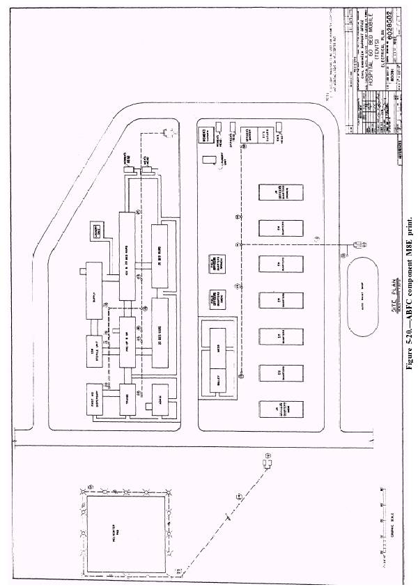 supported by assemblies. Figure 5-20 shows the electrical plan for a 60-bed mobile hospital, component M8E. Within this component, there are several facilities. Figure 5-21 shows all the facilities you will need to construct component M8E (Hospital 60 Bed Mobile). When you are assigned the task of constructing an advanced base using the ABFC system, your ability to read prints and use logic is basically the only requirement other than the components, facilities, and assemblies you will need. The prints give you a basic idea of how this particular advanced base component is to be layed out. Figure 5-22 shows facilities 811 10AU, 811 10AV, 811 10AW, and 811 10P, but, according to figure 5-21, the only facility drawing that you will need for this particular component is 811 10AU. Figure 5-23 shows one assembly (32601), which, along with six others, makes up facility 811 10AU. NCF First Class Petty Officer, NAVEDTRA 10601, describes how assemblies can be broken down even further by NSN numbers; as shown in figure 5-24.