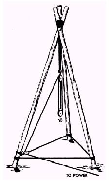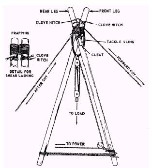 Figure 6-9.\Shear legs. Rigging In rigging the shears, place your two spars or poles on the ground parallel to each other with their butt ends even. Next, put a large block of wood under the tops of the legs just below the point of lashing, and place a small block of wood between the tops at the same point to facilitate handling of the lashing. Now, separate the poles a distance equal to about one third of the diameter of one pole. For lashing material, use 18- or 21-thread small stuff. In applying the lashing, first make a clove hitch around one of the legs. Then, take eight or nine turns around both legs above the hitch, working towards the top of the legs. Remember to wrap the turns tightly so that the finished lashing will be smooth and free of kinks. To apply the frapping (tight lashings), make two or three turns around the lashing between the legs; then, with a clove hitch, secure the end of the line to the other leg just below the lashing (fig. 6-9). Now, cross the legs of the shears at the tip and separate the butt ends of the two legs so that the spread between them is equal to one half of the height of the shears. Dig shallow holes about 1 foot (30 centimeters) deep at the butt end of each leg. The butts of the legs should be placed in these holes in erecting the shears. Placing the legs in the holes will keep them from kicking out in operations where the shears is at an angle other than vertical. The next step is to form the sling for the hoisting falls. To do this, take a short length of line, pass it a sufficient number of times over the cross at the top of the shear, and tie the ends together. Now, reeve a set of blocks and place the hook of the upper block through the sling; then secure the hook by mousing. Fasten a snatch block to the lower part of one of the legs, as shown in figure 6-9. If you need to move the load horizontally by moving the head of the shears, rig a tackle in the after guy near its anchorage. The guys\one forward guy and one after guy\are secured next to the top of the shears. Secure the forward guy to the rear leg and the after guy to the front leg, using a clove hitch in both instances. (See fig. 6-9.) Erecting Several crew members are needed for safe, efficient erection of the shears, the number being determined largely by the size of the rig. To help ensure good results, the erection crew should lift the top of the frame and walk it up by hand until the after guy tackle system takes over the load. When this point is reached, complete the raising of the shears into final position by hauling in on the tackle. Remember to secure the forward guy to its anchorage before raising the legs, and maintain a slight tension on the line to control the movement. Also, after the shears has been raised, lash the butt ends with chain, line, or boards to keep them from spreading when a load is applied. TRIPOD A tripod consists of three legs of equal length lashed together at the top. (See fig. 6-10.) The fact that the tripod can be used only where hoisting is vertical places it at a distinct disadvantage in comparison with other hoisting devices. Its use will be limited primarily to jobs that involve hoisting over wells, mine shafts, or other excavations. A major advantage of the tripod is its great stability. In addition, it requires no guys or anchorages, and its load capacity is approximately 1 1/2 times greater than for shears made of the same size timbers.