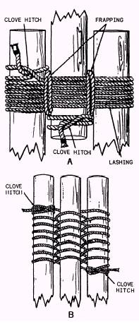 Figure 6-11.\Lashing for a tripod. means other than hand power is available for erection. First, place the three spars parallel to each other, leaving an interval between them slightly greater than twice the diameter of the line to be used. Rest the tip of each pole on a skid so that the end projects about 2 feet (60 centimeters) over the skid. Then, line up the butts of the three spars, as shown in view B, figure 6-11. Next, make a clove hitch on one outside leg at the bottom of the position the lashing will occupy, which is about 2 feet (60 centimeters) from the end. Now, proceed to weave the line over the middle leg, under and around the other outside leg, under the middle leg, over and around the first leg, and so forth, until completing about eight or nine turns. Finish the lashing by forming a clove hitch on the other outside leg, as shown in view B, figure 6-11. Erecting In the final position of an erected tripod, it is important that the legs be spread an equal distance apart. The spread between legs must be not more than two thirds, nor less than one half, the length of a leg. Small tripods, or those lashed according to the first procedure given in the preceding section, may be raised by hand. Here are the main steps that make up the hand-erection procedure. Start by raising the top ends of the three legs about 4 feet (1.2 meters), keeping the butt ends of the legs on the ground. Now, cross the tops of the two outer legs, and position the top of the third or center leg so that it rests on top of the cross. A sling for the hoisting tackle can be attached readily by first passing the sling over the center leg, and then around the two outer legs at the cross. Place the hook of the upper block of the tackle on the sling, and secure the hook by mousing. The raising operation can now be completed. To raise an ordinary tripod, a crew of about eight members may be required. As the tripod is being lifted, spread the legs so that when it is in the upright position, the legs will be spread the proper distance apart. After getting the tripod in its final position, lash the legs near the bottom with line or chain to keep them from shifting. (See fig. 6-10.) Where desirable, a leading block for the hauling part of the tackle may be lashed to one of the tripod legs, as shown in figure 6-10. In erecting a large tripod, you may need a small gin pole to aid in raising the tripod into position. When you are called on to assist in the erection of a tripod lashed according to the first lashing procedure described in the preceding section, the first thing to do is to raise the tops of the legs far enough from the ground to permit spreading them apart. Use guys or tag lines to help hold the legs steady while they are being raised. Now, with the legs clear of the ground, cross the two outer legs and place the center leg so that it rests on top of the cross. Then, attach the sling for the hoisting tackle. Here, as with a small tripod, simply pass the sling over the center leg and then around the two outer legs at the cross. |