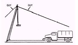 Figure 6-18.\Using a vehicular winch for hoisting. passing through the center of the drum is at right angles to the axis of the drum. The angle between this line and the hoisting line as it winds on the drum is referred to as the FLEET ANGLE. As the hoisting line is wound in on the drum, it moves from one flange to the other, causing the fleet angle to change during the hoisting process. See that the fleet angle does NOT exceed 2; and, where possible, keep it below this. A 1 1/2 maximum angle is satisfactory and will be obtained if the distance from the drum to the first sheave is 40 inches (100 centimeters) for each inch (2.5 centimeters) from the center of the drum to the flange. The wider the drum of the hoist, the greater the lead distance has to be when the winch is placed. Most winches, even those made by the same manufacturer, differ from each other in their operation. If you are not familiar with the operation of a winch to be used on a job, study the operating procedure described in the manufacturer's manual beforehand. The fundamentals of winch operation must be understood to ensure safe, efficient handling of materials. The use of hand signals in giving directions to operators of winches is especially important to the safety of both the crew member and the material being hoisted. CRANES The crane is one of the most useful pieces of construction equipment. It is also one of the most versatile. For instance, by rigging the crane chassis with a boom and lifting hook, you have an excellent device for lifting and moving heavy materials, machinery, and other objects. (See fig. 6-19.) The capacity of the crane for lifting depends on the boom length and angle. The capacity will be noted inside the cab of the crane, and this capacity should NOT be exceeded. You will not be required to operate the crane; that is the job of the Equipment Operator. But there are other important jobs, such as that of hook-on man or signalman, and you have to be able to handle either of these. |