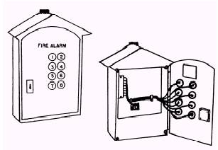 Figure 7-17.\Remote annunciator (weatherproof) Audible Signal Devices Any device that sounds an audible signal is classified as an audible signal appliance. The audible signal appliances most frequently used in building alarm systems are bells and horns. In addition, there are chimes, cowbells, buzzers, sirens, speakers, air horns, and steam whistles. Audible signals can be used to indicate either a fire alarm or a system-malfunction (trouble) condition. The audible signal appliances are connected to audible signal circuits for alarm or trouble indication (depending on their function) at the control unit. Figure 7-18 shows some of the commonly used audible signal appliances. Audible signal appliances have varying levels of sound output. Louder devices are for areas with high ambient sound levels or where the devices cannot be located near the area to be warned. Hospitals might use softer devices, such as chimes, to avoid frightening patients. Coded building alarm systems normally use single-stroke versions of bells or chimes so the coded signal can be clearly produced. Vibratory bells, chimes, or horns are used for noncoded systems but can also be used in coded systems if the mechanism used can respond rapidly enough to provide an accurate rendition of the code being transmitted. In a building that uses audible signals routinely, such as bells for announcing class periods in school, the fire alarm audible appliances must have a distinct, easily identified sound. If the fire alarm signal is coded, the coding provides the distinctive sound, and it is feasible (though not normal) to use the same bells for both functions. For a noncoded fire alarm system, necessary distinction of sound can be obtained by using a completely different type of audible signal appliance, such as a horn or siren, for sounding fire alarm signals. |