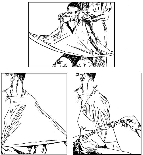 CRAVAT BANDAGE.-A triangular bandage can be folded into a strip for easy application during an emergency. When folded as shown in figure 3-18, the bandage is called a cravat. To make a cravat bandage, bring the point of the triangular bandage to the middle of the base and continue to fold until a 2-inch width is obtained. The cravat may be tied, or it may be secured with safety pins (if the pins are available). Figure 3-13.-Triangular bandage for the shoulder. |