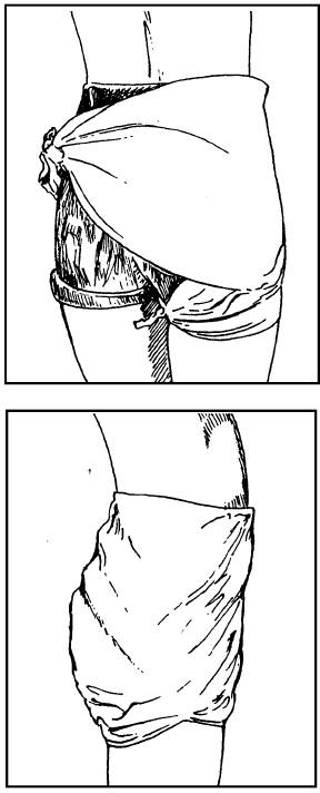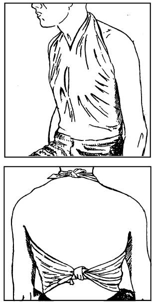Cravat Bandage for Eye.-After applying a compress to the affected eye, place the center of the cravat over the compress and on a slant so that the lower end is inclined downward. Bring the lower end around under the ear on the opposite side. Cross the ends in back of the head, bring them forward, and tie them over the compress. Figure 3-19 shows the proper application of a cravat bandage for the eye. Figure 3-14.-Triangular bandage for the chest. |