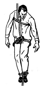 Emergency Rescue Lines As previously mentioned, the steel-wire lifeline can often be used to haul a person to safety. An emergency rescue line can also be made from any strong fiber line. Both should be used only in extreme emergencies, when an injured person must be moved and no other means is available. Figure 3-34 shows an emergency rescue line that could be used to hoist a person from a void or small compartment. Notice that a running bowline is passed around the body, just below the hips, and a half hitch is placed just under the arms. Notice also that a guideline is tied to the casualty's ankles to prevent banging against bulkheads and hatchways. Rescue Drag and Carry Techniques Manual carries are tiring for the bearer(s) and involve the risk of increasing the severity of the casualty's injury. In some instances, however, they are essential to save the casualty's life. Although manual carries are accomplished by one or two bearers, the two-man carries are used whenever possible. They provide more comfort to the casualty, are less likely to aggravate his injuries, and are also less tiring for the bearers, thus enabling them to carry him farther. The distance a casualty can be carried depends on many factors, such as strength and endurance of the bearer(s), ONE-RESCUER TECHNIQUES.-If a victim can stand or walk, assist him to a safe place. If there are no indications of injury to the spine or an extremity but the casualty is not ambulatory, he can be carried by means of any of the following: Fireman's Carry: One of the easiest ways to carry an unconscious person is by means of the fireman's carry. Figure 3-35 shows the steps of this procedure. Pack-strap Carry: With the pack-strap carry, shown in figure 3-36,