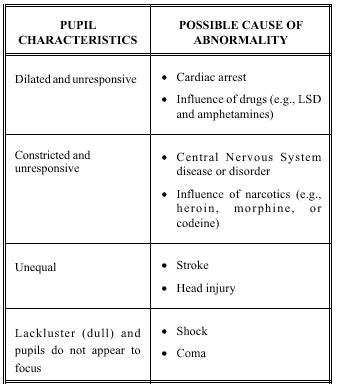 or clothing. Begin the survey by kneeling at the side of the patient's head. Quickly take an overview of the patient's body (i.e., general appearance, demeanor, behavior, skin color and characteristics, etc.), then perform the 26 steps described in the following sections. Step 1.-Check the cervical spine for point tenderness and deformity. To perform this procedure, gently slide your hands, palms up, under both sides of the patient's neck. Move your fingertips toward the cervical midline. Check the back of the neck from the shoulders to the base of the skull. Apply gentle finger pressure. A painful response to this pressure is point tenderness. If there are signs of possible spinal injury, such as midline deformities, point tenderness, or muscle spasms, stop the survey and provide stabilization of the head and neck. NOTE: If a rigid cervical collar is to be applied, make sure you have examined the posterior, anterior, and sides of the neck before applying the collar. Step 2.-Inspect the anterior neck for indications of injury and neck breathing. This procedure consists of exposing the anterior neck to check for injury and to detect the presence of a surgical opening (stoma) or a metal or plastic tube (tracheostomy). The presence of a stoma or tracheostomy indicates the patient is a neck breather. Also, if you have not already done so in the primary survey, check for a medical identification necklace. A necklace may state the patient has a stoma or tracheostomy. Look for signs of injury, such as the larynx or trachea deviated from the midline of the neck, bruises, deformities, and penetrating injuries. Also, check for distention of the jugular vein. If the jugular vein is distended, there may be an airway obstruction, a cervical spine injury, damage to the trachea, or a style="mso-spacerun: yes"> serious chest injury. All of these conditions require immediate medical care. After the anterior neck is inspected and if a spinal injury is suspected, apply a rigid cervical or extrication collar. If the patient is unconscious, assume the patient has a spinal injury. Step 3.-Inspect the scalp for wounds. Use extreme caution when inspecting the scalp for wounds. Pressure on the scalp from your fingers could drive bone fragments or force dirt into wounds. Also, DO NOT move the patient's head, as this could aggravate possible spinal injuries. To inspect the scalp, start at the top of the head and gently run your gloved fingers through the patient's hair. If you come across an injury site, DO NOT separate strands of the hair. To do this could restart bleeding. When the patient is found lying on his back, check the scalp of the back of the head by placing your fingers behind the patient's head. Then slide your fingers upward toward the top of the head. Check your fingers for blood. If a spinal or neck injury is suspected, delay this procedure until the head and neck have been immobilized. Furthermore, if you suspect a neck injury, DO NOT lift the head off the ground to bandage it. NOTE: You may find upon inspection that the patient is wearing a hairpiece or wig. Hairpieces and wigs may be held in place by adhesive, tape, or permanent glue, so DO NOT remove them unless you suspect profuse bleeding. Attempting removal may aggravate injury or restart bleeding. Step 4.-Check the skull and face for deformities and depressions. As you feel the scalp, check for depressions or bony projections. Visually examine facial bones for signs of fractures. Unless there are obvious signs of injury, gently palpate the cheekbones, forehead, and lower jaw. Step 5.-Examine the patient's eyes. After examining the face and scalp, move back to a side position. Begin your examination of the eyes by looking at the patient's eyelids. Do not open the eyelids of patients with burns, cuts, or other injuries to the eyelid(s). Assume there is damage to the eye and treat accordingly. If eyelids are not injured, have patients open their eyes. To examine the eyes of unconscious patients, gently open their eyes by sliding back the upper eyelids. Keep in mind, pressure applied to the eyelid may cause further injury. When the eye has been opened, visually check the globe of the eye. Step 6.-Check the pupils for size, equality, and reactivity. Using a penlight or flashlight, examine both eyes. Note pupil size and if both pupils are equal in size. Also, see if the pupils react to the beam of light. Note a slow pupil reaction to the light. Look for eye movement. Both eyes should move as a pair when they observe moving persons or objects. NOTE: Check unconscious patients for contact lenses. Prompt removal of contact lenses is recommended. If removal of the lens is impractical, close the patient's eyes so the contact lenses stay lubricated. Table 4-1 lists pupil characteristics you may encounter and the possible causes of abnormalities. Step 7.-Inspect the inner surfaces of the eyelids. Step 8.-Inspect the ears and nose for injury and the presence of blood or clear fluids. Without rotating the patient's head, inspect the ears and nose for cuts, tears, or burns. Use a penlight to look in the ears and nose for blood, clear fluids, or bloody fluids. Blood in the ears and clear fluids (cerebrospinal fluid) in the ears or nose are strong indicators of a skull fracture. Also, check for bruises behind the ears, commonly referred to as Battle's sign. Bruises behind the ears are strong indicators of skull fracture and cervical spine injury. Burned or singed nasal hairs indicate possible burns in the airway. Step 9.-Inspect the mouth. Look inside the mouth for signs of airway obstruction that may not have been observed during the primary survey (e.g., loose or broken teeth, dentures, and blood). When you inspect the mouth, remember not to rotate the patient's head. Step 10.-Smell for odd breath odors. Place your face close to the patient's mouth and nose and note any unusual odors. A fruity smell indicates diabetic coma or prolonged vomiting and diarrhe
