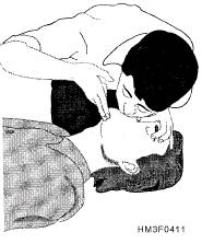 BREATHING The second aspect of basic life support is to restore breathing in cases of respiratory arrest. Failure of the breathing mechanism may be caused by various factors. They include complete airway obstruction, insufficient oxygen in the air, inability of the blood to carry oxygen (e.g., carbon monoxide poisoning), paralysis of the breathing center of the brain, and external compression of the body. Respiratory arrest is usually but not always immediately accompanied by cardiac arrest. Periodic checks of the carotid pulse must be made, and you must be prepared to start cardiopulmonary resuscitation (CPR). Signs of respiratory arrest are an absence of respiratory effort, a lack of detectable air movement through the nose or mouth, unconsciousness, and a cyanotic discoloration of the lips and nail beds. Determining Breathlessness Step 1 3/4 Place your ear over the patient's mouth and nose, while maintaining an open airway. Step 2 3/4 While observing the patient's chest, listen for air escaping during exhalation, and Recovery Position To place a patient in the recovery position, roll the patient onto his side so that the head, shoulders, and torso move simultaneously without twisting. If the patient has sustained trauma or trauma is suspected, the patient should NOT be moved. Artificial Ventilation Techniques of artificial ventilation include mouth-to-mouth, mouth-to-nose, mouth-to-stoma, and mouth-to-mask. These techniques as they apply to adult patients are discussed in the following sections. MOUTH-TO-MOUTH.-Artificial ventilation with the mouth-to-mouth technique is a quick, style="mso-spacerun: yes"> effective way to provide oxygen to the patient. The exhaled air contains enough oxygen to supply the patient's needs. To perform mouth-to-mouth ventilation, the airway must be open. To open the airway, perform the head tilt-chin lift or jaw-thrust maneuver. If there is no spontaneous breathing, start artificial ventilation by pinching the nose closed with your thumb and index
