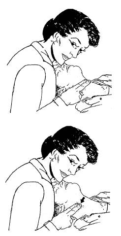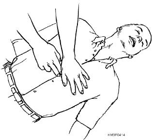 Gastric Distention Sometimes during artificial ventilation, air is forced into the stomach instead of into the lungs. The stomach becomes distended (bulges), indicating that the airway is blocked or partially blocked, or that ventilations are too forceful. This problem is more common in children but can occur with adults as well. A slight bulge is of little worry, but a major distention can cause two serious problems. First, it reduces lung volume: the distended stomach forces the diaphragm up. Second, there is a strong possibility of vomiting. The best way to avoid gastric distention is to position the head and neck properly and/or limit the volume of ventilations delivered. NOTE: THE AMERICAN RED CROSS (ARC) STATES THAT NO ATTEMPT SHOULD BE MADE TO FORCE AIR FROM THE STOMACH UNLESS SUCTION EQUIP-MENT IS ON HAND FOR IMMEDIATE USE. If suction equipment is ready and the patient has a marked distention, you can turn the patient on his side facing away from you. With the flat of your hand, apply gentle pressure between the navel and the rib cage. Be prepared to use suction should vomiting occur. CIRCULATION A rescuer knowing how to administer cardiopulmonary resuscitation (CPR) greatly increases the chances of a victim's survival. CPR consists of external heart compression and artificial ventilation. External heart compression is performed on the outside of the chest, and the lungs are ventilated by the mouth-to-mouth, mouth-to-nose, mouth-to- stoma, or mouth-to-mask techniques. To be effective, CPR must be started within 4 minutes of the onset of cardiac arrest. The victim should be supine on a firm surface. CPR should not be attempted by a rescuer who has not been properly trained. If improperly done, CPR can cause serious damage. It must never be practiced on a healthy individual. For training purposes, use a training aid instead. To learn this technique, see your yes"> medical education department or an American Heart Association-or American Red Cross-certified Hospital Corpsman, nurse, or physician. One-Rescuer CPR DETERMINING PULSELESSNESS.-Once the airway has been opened, check for the carotid pulse. The carotid artery is most easily found by locating the larynx at the front of the neck and then sliding two fingers down the side of the neck toward you (fig. 4-13). The carotid pulse is felt in the groove between the larynx and the sternocleidomastoid muscle. If the pulse is present, ventilate as necessary. If the pulse is absent, locate the sternum and begin chest compressions. PROPER POSITIONING OF HANDS ON STERNUM.-To locate the sternum, use the middle and index fingers of your lower hand to locate the lower margin of the victim's rib cage on the side closest to you (fig. 4-14). Then move your fingers up along the edge of the rib cage to the notch where the ribs meet the sternum in the center of the lower chest. Place your middle finger on the notch and your index finger next to it. Place the heel of your other hand along the midline of the sternum next to your index finger. Remember to keep the heel of your hand off the xiphoid (tip of the sternum). Afracture in this area may damage the liver, causing hemorrhage and death. CHEST COMPRESSIONS.-Place the heel of one hand directly on the sternum and the heel of the other on top of the first. Interlock your fingers or extend them straight out and KEEPTHEMOFFTHE VICTIM'S CHEST! Effective compression is accomplished by locking your elbows into position, straightening your arms, and positioning your shoulders directly over hands so that the thrust for each chest compression is straight down on the sternum. See figure 4-15. The sternum should be depressed approximately 1 1/2 to 2 inches (for adults). Release chest compression pressure between each compression to allow blood to flow into the chest and heart. When releasing chest compression pressure, remember to keep your hands in place on the chest. Not only will you feel less fatigue if you use the proper technique, but a more effective compression