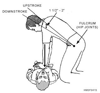 Figure 4-15.-Proper position of the rescuer. PERFORMANCEANDREASSESSMENTOF CPR.-When one rescuer performs CPR, the ratio of compressions to ventilations is 15 to 2, and it is performed at a rate of 80 to 100 compressions per minute. Vocalize: "one and, two and, three and,..." until you reach 15. After 15 compressions, you must give the victim two slow ventilations (1 1/2 to 2 seconds). Continue for four full cycles. Quickly check for the carotid pulse and spontaneous breathing. If there are still no signs of recovery, continue CPR with compressions. Reassess the patient every few minutes thereafter. If a periodic check reveals a return of pulse and respiration, discontinue CPR and place the victim in the recovery position. Continue monitoring the victim and be prepared to restart CPR . |