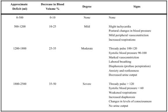 symptoms of morphine use.) The face and skin may be very pale or ashen gray; in the dark complexioned, the mucous membranes may be pale. The lips are often cyanotic. The skin feels cool and is covered with clammy sweat. The skin's coolness is related to a decrease in the peripheral circulation. The pulse tends to become rapid, weak, and thready. If the blood pressure is severely lowered, the peripheral pulse may be absent. The pulse rate in hemorrhagic shock may reach 140 or higher. In neurogenic shock, however, the pulse rate is slowed, often below 60. The blood pressure is usually lowered in moderately severe shock; the systolic pressure drops below 100, while the pulse rises above 100. The body is compensating for circulatory fluid loss by peripheral vasoconstriction. This process tends to maintain the blood pressure at a nearly normal level despite a moderately severe loss of circulating blood volume. Apoint comes, however, when decompensation occurs, and a small amount of additional blood loss will produce a sudden, alarming fall in blood pressure. There may be nausea, vomiting, and dryness of the mouth, lips, and tongue. Surface veins may collapse. Veins normally visible at the front of the elbow, forearms, Table 4-2.-Correlation of Magnitude of Volume Deficit and Clinical