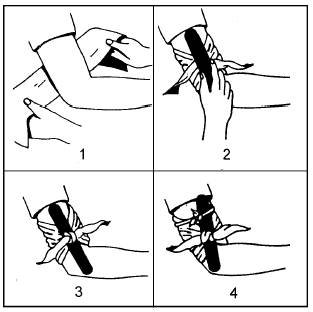 Internal soft-tissue injuries may result from deep wounds, blunt trauma, blast exposure, crushing accidents, bone fracture, poison, or sickness. They may range in seriousness from a simple contusion to life-threatening hemorrhage and shock. Visible Indications Hematemesis (vomiting bright red blood) Hematuria (passing of blood in the urine) Pale, moist, clammy skin Tinnitus Figure 4-28.-Applying a tourniquet. |