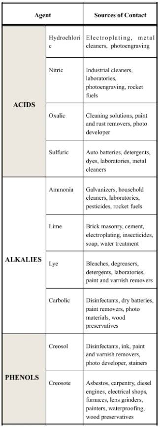 Corrosives Acids and alkalies (bases) produce actual chemical burning and corrosion of the tissues of the lips, mouth, throat, and stomach. Acids do most of their damage in the acidic stomach environment, while alkalies primarily destroy tissues in the mouth, throat, and esophagus. Stains and burns around the mouth, and the presence of characteristic odors provide clues as to an acid or base ingestion. Swallowing and breathing may be difficult, especially if any corrosive was aspirated into the lungs. Stridor, a high-pitched sound coming from the upper airway, may be heard. The abdomen may be tender and swollen with gas, and perforation of the esophagus or stomach may occur. NEVER ATTEMPT TO TREAT AN ACID OR BASE INGESTION BY ADMINISTERING A NEUTRALIZING SOLUTION BY MOUTH. GIVE WATER ONLY, UNLESS DIRECTED BYA POISON CONTROL CENTER (PCC) OR MEDICAL OFFICER. Monitor the ABC+D&Es, and watch for signs of shock. Examples of corrosive agents and sources of contact are listed in table 5-3. When providing treatment for the above poisons, DO NOT INDUCE VOMITING. The damage to the mouth and esophagus will be compounded. In addition, the threat of aspiration during vomiting is too great. Gastric lavage could cause perforation of the esophagus or stomach. Therefore, use it only on a doctor's order. First aid consists of diluting the corrosive and keeping alert for airway potency and shock. If spontaneous vomiting occurs, administer an antiemetic. Irritants Petroleum Distillates or Hydrocarbons When providing treatment for the ingestion of petroleum distillates, DO NOT INDUCE VOMITING unless told to do so by a physician or poison control center. Vomiting may cause additional poison to enter the lungs. However, the quantity of poison swallowed or special petroleum additives may make gastric lavage or the use of cathartics advisable. If a physician or poison control center cannot be reached, give the victim 30 to 60 ml of vegetable oil. Transport the victim immediately to a medical treatment facility. Food Poisoning Most bacterial and viral food poisonings appear within 8 hours of ingesting food. The signs and symptoms of poisoning include nausea, vomiting, diarrhea, muscle aches, and low-grade fever. The general treatment is supportive and directed at preventing dehydration through the administration of fluids. If diarrhea persists more than 24 hours, or if the patient is unable to keep fluids down, further definitive medical care is necessary. Food poisoning can also occur from ingestion of parasites. Marine food-borne illnesses from ingesting fish and shellfish is a concern especially when traveling to new destinations. Wherever you are in the world, you should learn which local seafood is known to be safe and which present the potential for harm. Table 5-4 lists some of toxins found in fish and shellfish and their potential sources. Mussels, clams, oysters, and other shellfish often become contaminated with bacteria during the warm months of March through November (in the northern hemisphere). Numerous varieties of shellfish should not be eaten at all. Therefore, wherever you are in the world, you should learn which local seafoods are known to be safe and which present the potential for harm. Table 5-3.-Examples of Common Acids, Alkalies, and