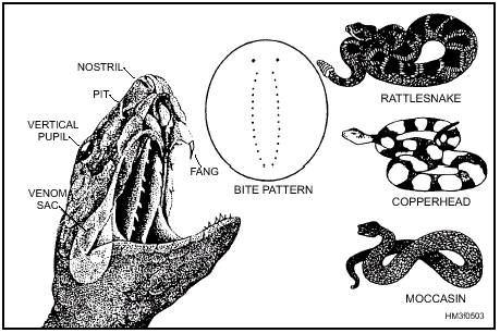 Figure 5-3.-American pit vipers. Venom, which is stored in sacs in the snake's head, is introduced into a victim through hollow or grooved fangs. An important point to remember, however, is that a bitten patient has not necessarily received a dose of venom. The snake can control whether or not it will release the poison and how much it will inject. As a result, while symptoms in a poisonous snakebite incident may be severe, they may also be mild or not develop at all. |