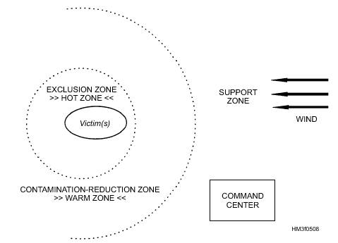 Figure 5-8.-Hazard zone management sections Observe all safety precautions and directions given by the on-site HAZMAT expert. All orders should be given and received face to face. Stay clear of restricted areas until the on-site HAZMAT expert declares them to be safe. |
