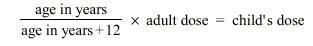 The age in years of the child is the numerator, and the age plus 12 is the denominator. This fraction is multiplied by the normal adult dose.