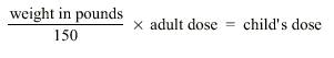 The child's weight in pounds is the numerator, and the average adult weight (150 pounds) is the denominator. This fraction is multiplied by the adult dose.