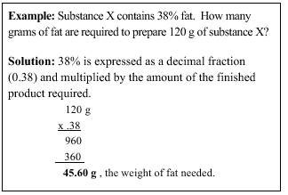 PERCENTAGE CALCULATIONS Percentage means "parts per hundred" or the expression of fractions with denominators of 100. Thus, a 10 percent solution may be expressed as 10%, 10/100, 0.10, or 10 parts per 100 parts. It is often necessary for the pharmacist to compound solutions of a desired percentage strength. Percentage in that respect means parts of active ingredient per 100 parts of total preparation. Following are the three basic rules to remember in solving percentage problems: 1. To find the amount of the active ingredient when the percentage strength and the total quantity are known, multiply the total weight or volume by the percent (expressed as a decimal fraction).