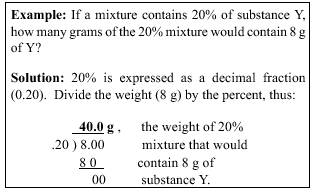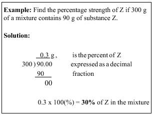 3. To find the percentage strength when the amount of the active ingredient and the total quantity of the mixture are known, divide the weight or volume of the active ingredient by the total weight or volume of the mixture. Then multiply the resulting answer by 100 to convert the decimal fraction to percent.