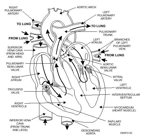 Figure 1-33.-Frontal view of the heart-arrows indicate blood flow.