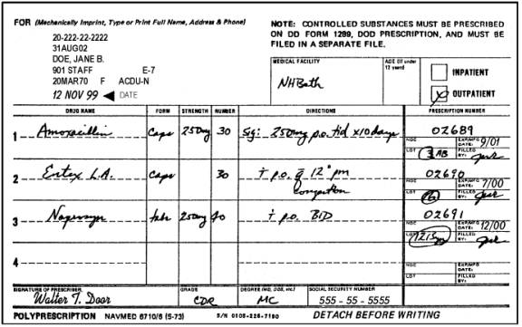 AUTHORIZED PRESCRIBERS According to the MANMED, the following persons are authorized to write prescriptions: Medical and Dental Corps Officers Medical Service Corps optometrists, physician assistants, and podiatrists Civilian physicians employed by the Navy Independent duty Hospital Corpsmen Nurse anesthetists and midwives (may prescribe within the scope of their practice when authorized in writing by the CO or delegated representative) Prescriptions written by civilian prescribers, other than those employed by the Navy, may be filled for authorized beneficiaries, provided the prescribed item is on the medical facility's formulary (a published listing of medications) and the prescribed quantity is within limitations established by the command. With the exception of the polyprescription, prescriptions are limited to one item per prescription. The quantity of the drug prescribed should be a reasonable amount needed by the patient. Excessive or unrealistic quantities should not be prescribed. Erasures on prescriptions are prohibited, and interlineations (information inserted between lines of writing) must be initialed. Figure 6-4.-Polyprescription form. FILLING PRESCRIPTIONS Prescription Verification Study the prescription carefully and make sure that the drug prescribed is reasonable, that its amount or dosage is realistic in consideration of the patient's age, and that the quantity of the medication is practical. A prescription calling for 1,000 tetracycline tablets or a pint of paregoric, for example, warrants further inquiry. If, in the process of verification, you feel that there is a discrepancy, an ambiguity, or an incompatibility, or for any reason you find it is necessary to consult the yes"> prescriber, never allow the patient to suspect that anything is amiss. You should never fill a prescription you do not completely understand or that you feel is incorrect. What appears to be an overdose may be the desired dose for a specific patient, but the prescriber will appreciate being called for verification. When you are sure you understand the prescription and are satisfied that it is in all respects correct, you should give its filling your undivided attention. Most mistakes are made when the person filling the prescription is either interrupted while doing so or is trying to accomplish more than one task at a time. During the process of filling a prescription, the label on the containers used in filling the prescription should be verified at least three times. Initially, the label should be read when the container is taken from the shelf. Then it should be read again when the contents are removed from the container. And finally, the container's label should be read before it is returned to the shelf. By following these three verification steps for each prescription you fill, you will reduce the possibility of making a prescription error. |