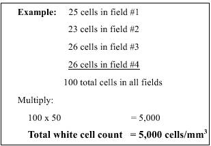 Materials Required for Unopette Procedure The Unopette method uses a disposable diluting pipette system that provides a convenient, precise, and accurate method for obtaining a white blood cell count. When the Unopette method is used, whole blood is added to a diluent. The diluent lyses (destroys) the red blood cells, but preserves the white blood cells. Once the red cells are completely lysed, the solution will be clear. The diluted blood is then added to a hemacytometer. Once the hemacytometer is loaded, the cells should be allowed to settle for 10 minutes before counting proceeds. The following materials are required to perform a white blood cell count using the Unopette method: Disposable Unopette for WBC counts, which consists of -a shielded capillary pipette (20 microliter (Fl) capacity), and Unopette Procedure The Unopette procedure for counting white blood cells is as follows: 1. Puncture the diaphragm in the neck of the reservoir with the tip of the capillary pipette shield. See figure 7-9. 2. After you obtain free-flowing blood from a lancet puncture of the finger, remove the protective plastic shield from the capillary pipette. Hold the capillary pipette slightly above the horizontal and touch the tip to the blood source (fig. 7-10, view A). The pipette will fill by capillary action. When blood reaches the end of the capillary bore in the neck of the pipette, filling is complete and will stop automatically. The amount of blood collected by the capillary tube is 20 Fl. Wipe any blood off the outside of the capillary tube, making sure no blood is removed from inside the capillary pipette. (An alternative source of blood is a thoroughly mixed fresh venous blood sample obtained by venipuncture. See figure 7-10, view B.) 3. With one hand, gently squeeze the reservoir to force some air out, but do not expel any diluent (fig. 7-11). Maintain pressure on the reservoir. With the other hand, cover the upper opening of the capillary overflow chamber with your index finger and seat the capillary pipette holder in the reservoir neck (fig. 7-11). 4. Release pressure on the reservoir and remove your finger from the overflow chamber opening. Suction will draw the blood into the diluent in the reservoir. 5. Squeeze the reservoir gently two or three times to rinse the capillary tube, forcing diluent into but not out of the overflow chamber, releasing pressure each time to return diluent to the reservoir. Close the upper opening with your index finger and invert the unit several times to mix the blood sample and diluent. See figure 7-12. 6. For specimen storage, cover the overflow chamber of the capillary tube with the capillary shield. 7. Immediately prior to cell counting, mix again by gentle inversion, taking care to cover the hole with your index finger. 8. Place the coverglass on the hemacytometer counting chamber, making sure the coverglass is clean and grease-free. (Fingerprints must be completely removed.) 9. Remove the pipette from the reservoir. Squeeze the reservoir and reseat the pipette in the reverse position. Release pressure to draw any fluid in the capillary tube into the reservoir. Invert and fill the capillary pipette by gentle pressure on the reservoir. After discarding the first 3 drops, load (charge) the counting chamber of the hemacytometer by gently squeezing the reservoir while touching the tip of the pipette against the edge of the coverglass and the surface of the counting chamber (fig. 7-13). A properly loaded counting chamber should have a thin, even film of fluid under the coverglass (fig. 7-14, view A). Allow 3 minutes for the cells to settle. If fluid flows into the grooves (moats) at the edges of the chamber or if you see air bubbles in the field, the chamber is flooded and must be cleaned with distilled water, dried with lens tissue, and reloaded (fig. 7-14, view B). If the chamber is underloaded, carefully add additional fluid until properly loaded. 10. Place the loaded hemacytometer into a petri dish with a piece of dampened tissue to keep the hemacytometer from drying out (fig. 7-15). Allow 5 to 10 minutes for the cells to settle. 11. Once the cells have settled, place the hemacytometer on the microscope. Using the high-power objective, count the WBCs in the four corner fields of the hemacytometer chamber (fields A, B, C, and D of figure 7-16). Each field is composed of 16 small squares. To count the cells in each field, start in the upper left small square and follow the pattern indicated by the arrow in field B of figure 7-16. Count all of the cells within each square, including cells touching the lines at the top and on the left. Do not count any cells that touch the lines on the right or at the bottom. 12. When all the cells in the 4 fields have been counted, multiply the count by 50. This will give you the total number of white cells per cubic millimeter of blood.