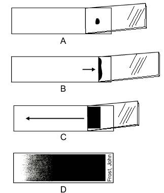 WARNING Wright's staining solution contains methanol, which is considered a hazardous material. It is classified as flammable, a poison, and an irritant. Methanol must be kept away from heat, sparks, and open flames. Good ventilation in usage areas is paramount since exposure to vapors can irritate eyes, nose, throat, and mucous membranes of the upper respiratory tract. When not in use, methanol containers should be closed tightly and stored upright to prevent leakage. Gloves and protective clothing (e.g., lab coat or apron) and eyewear should be worn to avoid contact with the solution. Absorption through skin can cause permanent blindness. Death may result from ingestion or exposure to high vapor concentrations of methanol. There are a variety of staining products on the market today. Some of these staining products have combined Wright's solution with other staining solutions, such as Giemsa stain. When using a new product, you should always review the manufacturer's usage and safety recommendations. The staining process that we will cover in this chapter is known as a quick stain. A quick stain has very few equipment requirements and only a few procedural steps. An example of a quick stain is One Step II Wright-Giemsa Stain Solution(r) by Criterion Sciences. To stain a blood smear with this product, follow the steps below. 1. Prepare two staining containers by filling one with One Step II stain solution and the other with deionized or distilled water. The use of tap water instead of deionized or distilled water is not recommended since the pH of tap water varies. If tap water is used, its pH should between 5.8 and 7.03. 2. Immerse the slide (blood smear) in the stain for 15 to 30 seconds. (To prevent debris or precipitate from contaminating the slide, do not add new stain to old.) 3. Remove the slide and allow excess stain to drain from the edge of the slide. 4. Immerse the slide in the deionized or distilled water for 5 to 15 seconds. (Change the water when it becomes dark blue or when film forms on the surface.) NOTE: Rinse time is critical and must be shorter than the stain time.