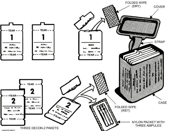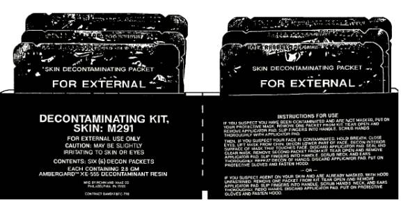 Prompt decontamination (decon) of the skin is imperative. Decon of chemical agents on the skin within 1 minute after contamination is perhaps 10 times more effective than if decontamination is delayed 5 minutes. Detailed instructions on the use of skin decontamination kits can be found in the NAVMED P-5041, Treatment of Chemical Agent Casualties and Conventional Military Chemical Injuries, and in the kits themselves. Finally, there are two types of antidote autoinjectors-atropine and 2-PAMCl-for your own Figure 8-1.-M291 skin decontamination kit.