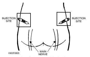 Figure 8-5.-Buttocks injection site. Mark the casualty, if necessary. Do not fasten the hood. Administer, in rapid succession, three sets of the nerve-agent antidotes. Follow the procedures for administration as described previously in the self-aid section. NOTE: Use the casualty's own autoinjectors when providing aid. Do not use your injectors on a casualty. If you do, you may not have any antidote available when needed for self-aid. |