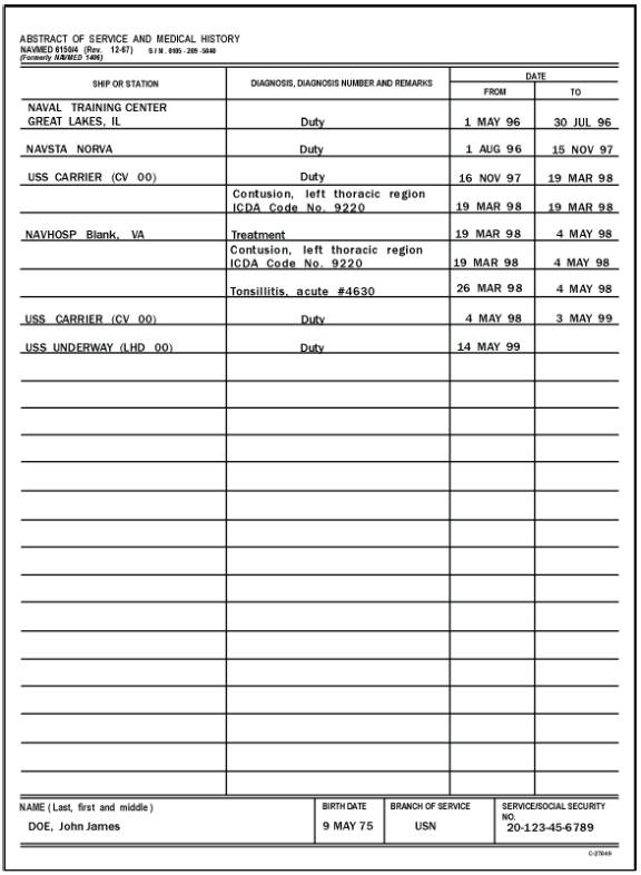 All personnel performing international travel should be immunized in accordance with NAVMEDCOMINST 6230.15, Immunizations and Chemoprophylaxis, and the current edition of FM 8-33/NAVMED P-5038, Control of Communicable Diseases of Man. Service members should have a properly completed and authenticated PHS-731 form (International Certificates of Vaccination) in their possession. The PHS-731 form is issued to service members for independent international travel. This form, kept by the individual, is a personal record of immunizations. The PHS-731 is not to be filed in the HREC at any time. Any immunizations recorded on the PHS-731 should be transcribed onto the SF 601. According to international rules, entries on the PHS-731 require authentication for immunizations against smallpox (if administered), yellow fever, cholera, and anthrax. Authentication (proof the immunization has been given) is accomplished by stamping each entry with the Department of Defense (DoD) immunization stamp and by the healthcare provider's signature. The signature block may be stamped or typewritten and authenticated with the healthcare provider's signature. ABSTRACT OF SERVICE AND MEDICAL HISTORY (NAVMED 6150/4) This form provides a chronological history of the ships and stations to which a member has been assigned for duty and treatment, and an abstract of medical history for each admission to the Sick List. A NAVMED 6150/4 (fig. 12-7) is prepared upon opening the health record, and it remains with the health record regardless of any change in the member's status. Continuation sheets are incorporated whenever a current abstract is completely filled. Complete columns of the NAVMED 6150/4 as follows: Ship or Station column. Enter the name of the ship or command to which the member is attached for duty or treatment. Date column. Indicate in the "From" and "To" subcolumns all dates of reporting and detachment for duty or dates of admission and discharge from the Sick List. Upon transfer for temporary duty (TDY), make an entry only if the HREC accompanies the individual to the place of TDY. NAVMED 6150/4 is retained as a permanent part of the HREC. Whenthe record is closed, make an entry indicating the date, title of servicing activity, and explanatory circumstances. Upon discharge and immediate reenlistment, or change in status, an appropriate entry to this effect should be made on the current NAVMED 6150/4. Subsequent chronological entries are continued on the same form. RECORD OF OCCUPATIONAL EXPOSURE TO IONIZING RADIATION (DD FORM 1141) This form is initiated when military personnel are first exposed to ionizing radiation (with the exception of patients incurring such radiation while undergoing diagnostic treatment). This form becomes a permanent part of the member's health record. Instructions for preparing DD Form 1141 are on the back of the form. Further instruction concerning the applicability and use of the form are contained in the Radiation Health Protection Manual, NAVMED P-5055. Figure 12-7.-Abstract of Service and Medical History, NAVMED 6150/4. |