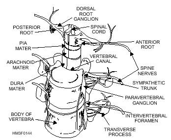 Figure 1-44.-Spinal cord. The spinal cord may be thought of as an electric cable containing many wires (nerves) that connect parts of the body with each other and with the brain. Sensations received by a sensory nerve are brought to the spinal cord, and the impulse is transferred either to the brain or to a motor nerve. The majority of impulses go to the brain for action. However, a system exists for quickly handling emergency situations. It is called the reflex arc. If you touch a hot stove, you must remove your hand from the heat source immediately or the skin will burn very quickly. But the passage of a sense impulse to the brain and back again to a motor nerve takes too much time. The reflex arc responds instantaneously to emergency situations like the one just described. The sensation of heat travels to the spinal cord on a sensory nerve. When the sensation reaches the spinal cord, it is picked up by an interneuron in the gray matter. This reception then triggers the appropriate nerve to stimulate a muscle reflex drawing the hand away. An illustrated example of the reflex arc is shown in figure 1-45. The reflex arc works well in simple situations requiring no action of the brain. Consider, however, what action is involved if the individual touching the stove pulls back and, in so doing, loses balance and has to grab a chair to regain stability. Then the entire spinal cord is involved. Additional impulses must travel to the brain, then down to the muscles of the legs and arms to enable the individual to maintain balance and to hold on to a steadying object. While all this activity is going on, the stimulus is relayed through the sympathetic autonomic nerve fibers to the adrenal glands, causing adrenalin to flow, which stimulates heart action. The stimulus then moves to the brain, making the individual conscious of pain. In this example, the spinal cord has functioned not only as a center for spinal relaxes, but also as a conduction pathway for other areas of the spinal cord to the autonomic nervous system and to the brain. |