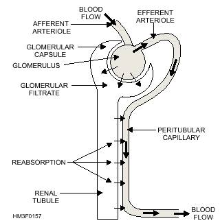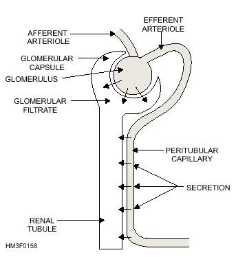 REABSORPTION.-As glomerular filtrate passes through the renal tubule, some of the filtrate is reabsorbed into the blood of the peritubular capillary (fig. 1-57). The filtrate entering the peritubular capillary will repeat the filtration cycle. This process of reabsorption changes the composition of urine. For instance, the filtrate entering the renal tubule is high in sugar content, but because of the reabsorption process, urine secreted from the body does not contain sugar. SECRETION.-Secretion is the process by which the peritubular capillary transports certain substances directly into the fluid of the renal tubule (fig. 1-58). These substances are transported by similar mechanisms as used in the reabsorption process, but done in reverse. For example, certain organic compounds, such as penicillin and histamine, are secreted directly from the proximal convoluted tubule to the renal tubule. Also, large quantities of hydrogen ions are secreted in this same manner. The secretion of hydrogen ions plays an important role in regulating pH of body fluids. The glomerulus filters gallons of blood each day. It is estimated that 2,500 gallons of blood pass through the kidneys in 24 hours, and about 80 gallons of glomerular filtrate. All the water from this filtrate is reabsorbed in the renal tubules except that containing the concentrated waste products.