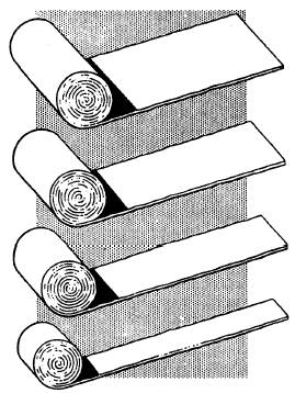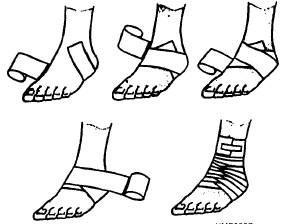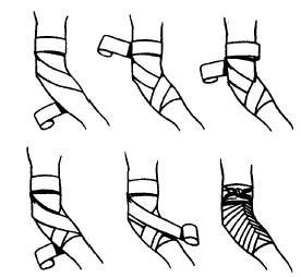 ROLLER BANDAGE FOR ANKLE AND FOOT.-The figure-eight bandage is also used for dressings of the ankle, as well as for supporting a sprain. While keeping the foot at a right angle, start a 3-inch bandage around the instep for several turns to anchor it. Carry the bandage upward over the instep and around behind the ankle, forward, and again across the instep and down under the arch, thus completing one figure-eight. Continue the figure-eight turns, overlapping one-third to one-half the width of the bandage and with an occasional turn around the ankle, until the compress is secured or until adequate support is obtained (fig. 3-6). ROLLER BANDAGE FOR HEEL.-The heel is one of the most difficult parts of the body to bandage. Place the free end of the bandage on the outer part of the ankle and bring the bandage under the foot and up. Then carry the bandage over the instep, around the heel, and back over the instep to the starting point. Overlap the lower border of the first loop around the heel and repeat the turn, overlapping the upper border of the loop around the heel. Continue this procedure until the desired number of turns is obtained, and secure with several turns around the lower leg (fig. 3-7). ROLLER BANDAGE FOR ARM AND LEG.-The spiral reverse bandage must be used to cover wounds of the forearms and lower extremities; Figure 3-4.-Roller bandage for the elbow.