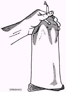 Figure 13-13.\Holding the solution bag. hold the medication valve under your thumb, so that the medication valve does not come into contact with the solution valve. 4. Remove the cover from the piercing device. Insert the piercing device into the solution valve on the bag. 5. Invert the solution bag and hang it on a rack at least 30 inches above the casualty's head. 6. Remove the airway valve at the top of the drip chamber on the infusion set. 7. Press and release the sides of the drip chamber. This will pump the solution into the chamber. Continue until the chamber is one-half full. 8. Grasp the end of the needle cover and uncover the needle. CAUTION Do not touch the needle or the bottom lip of the needle cover. 9. Hold the needle so the point is down, and then open the roller clamp. Allow the air solution to flow through the tubing until the tubing is filled and all air bubbles are expelled. 10. Close the roller clamp, and then put the cover back on the needle. Inserting An IV.\To infuse an IV solution, perform the following procedures: 1. Choose the insertion site, usually one of the veins in the forearm. Apply a constricting band to the casualty's upper arm. The constricting band should be just tight enough to stop blood flow in the vein. It should not be so tight that it cuts off blood flowing in the arteries. 2. You may have to immobilize the casualty's arm. This is done by placing an armboard under the arm and securing the board with bandages above the tourniquet and at the wrist. 3. Locate the vein. This can often be done visually because the tourniquet helps the vein to stand out. Or you can have the casualty clench and unclench the fist several times. As the casualty does this, examine the insertion site with your fingers to detect the vein by touch. It may also help to slap the skin over the vein with your fingers. 4. After locating the vein, thoroughly clean the insertion site with an alcohol sponge. 5. The next step is venipuncture, the piercing of the vein with the needle. Usually a medical officer will do this. However, if you are in a mass casualty situation and if you have had training in venipuncture, the medical officer may direct you to insert the needle. To insert the needle: a. Remove the protective cover from the needle. Do not touch the needle. b. Hold the needle so it points toward the casualty's upper arm. One side of the needle is beveled, or slanted. Usually, the needle is inserted in the vein with the beveled side up. The only exception to this would be if the casualty's veins are very small. c. Hold the needle firmly. The tip of the needle should be directly over the vein. The needle should be at about a 10- to 20-degree angle with the skin. d. Place the thumb of your free hand about 2 inches beyond the insertion site and stretch the skin tight. e. Pierce the skin with the needle, and then immediately lower the needle so it is almost parallel with the skin. Exerting slight upward pressure to the needle, slowly and steadily push it forward through the top wall of the vein. Still exerting slight upward pressure, very slowly and very carefully advance the needle along the top wall of the vein for a distance of about 1 inch. The upward pressure will cause the vein to rise slightly. Do not exert downward pressure, as the needle could puncture the bottom wall of the vein. 6. Secure the needle in place with one or two strips of adhesive tape. Make a loop in the tubing and then secure the tubing in place with adhesive tape. 7. Adjust the roller clamp on the tubing for the proper flow rate, as directed by the medical officer. You can determine the flow rate by observing the drip chamber for 1 minute. The usual flow rate is 40 to 60 drops per minute. 8. While the fluid is being infused, the officer may have you monitor the casualty. Try to keep the casualty still, so the patient doesn't dislodge the needle. Observe the drip chamber on the infusion set to see that the fluid flows properly. If there is any irregularity in the flow rate or if the fluid stops flowing, inform the officer at once. When the solution bag is almost empty, inform the medical officer. Be on the lookout for any of the following reactions and report them to the officer immediately: Casualty shivers or shows signs of being chilly. Those hopelessly wounded or dead on arrival. Casualty's pulse rate increases. Casualty's color changes. Signs of swelling around the needle insertion site. 9. When the casualty has received enough fluid, the officer may direct you to remove the infusion set. To do this, close the roller clamp on the tubing. Remove the tape used to hold the needle and tubing in place. Place an alcohol sponge over the needle insertion site, and withdraw the needle. After withdrawing the needle, press the alcohol sponge over the insertion site until bleeding stops. 10. Discard the solution bag and the infusion set. They cannot be reused. TRANSPORTING AN IV CASUALTY.\ When the casualty is stabilized and ready to be moved, elevate the fluid container well above the level of the casualty's heart. If you are using fluid in a bag, place the bag under the patient until it can be hung up. During transporting, continue to monitor the IV to ensure that it does not become dislodged. When moving over rough terrain or heavy underbrush, you can stop the IV drip for 4 or 5 minutes, the treatment provided in the field or at the site so that medical personnel providing definitive treatment will know what emergency measures were taken and the circumstances involved. To aid in this documentation, or mass situation, it is important for you to document use the U.S. Field Medical Card. PREPARING MEDICAL TAGS.\In a combat if necessary. Strap the container to the casualty so that the needle does not become dislodged.