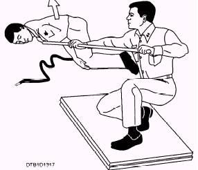 Figure 13-17.\Pushing a casualty away from a power line. itself. Start cardiopulmonary resuscitation (CPR) (explained in Dental Technician, Volume 2, NAVEDTRA 12573, chapter 9) immediately and continue until the casualty regains a normal heartbeat and breathing pattern. Finally, lightly cover the site of the burn with a preferably dry sterile dressing, treat for shock, and transport the casualty to a medical facility. HEAT EXPOSURE INJURIES.\Excessive heat affects the body in a variety of ways. When a person exercises in a hot environment, heat builds up inside the body. The body automatically reacts to get rid of this heat through the sweating mechanism. If the body loses large amounts of water and salt from sweating, heat cramps and heat exhaustion are likely to follow. When the body becomes overheated and cannot eliminate the excessive heat, heat stroke will result. Heat Cramps.\Heat cramps usually affect people who work in hot environments or who engage in strenuous exercise without acclimatization and proper training. Excessive sweating may result in painful heat cramps in the muscles of the abdomen, legs, and arms. Heat cramps may also result from drinking ice water or other cold drinks either too quickly or in too large a quantity after exercise. Muscle cramps are often an early sign of approaching heat exhaustion. Muscle spasms or heat cramps usually last only a few minutes and disappear spontaneously. To provide emergency treatment for heat cramps, move the casualty to a cool place. Heat cramps are caused by loss of salt and water, so give the casualty plenty of water to drink, adding about 1 teaspoon of salt to a quart of water. Apply manual pressure to the cramped muscle, or gently massage it to relieve the spasm. If the heat cramps do not pass, or if they become more severe, other symptoms may follow. The casualty should be treated as a heat exhaustion casualty and then transferred to a medical facility for further treatment. Heat Exhaustion.\Heat exhaustion is the most common condition resulting from exposure to hot environments. Heat exhaustion is not easily diagnosed because it can be a combination of several factors. Because of these factors, the signs and symptoms may vary. As a general rule, heat exhaustion will involve a serious disturbance of blood flow to the brain, heart, and lungs. This may cause the casualty to experience weakness, fatigue, headache, loss of appetite, and nausea. The person may faint, but will probably regain consciousness when the head is lowered to improve the blood supply to the brain. The casualty will appear ashen gray, the skin will be cold, moist, clammy, and the pupils of the eyes may be dilated (enlarged). Vital signs are usually normal but the casualty may have a weak pulse, together with rapid, shallow breathing. The body temperature may be below normal. Treat the casualty as if the patient were in shock. Move the person to a cool or air-conditioned area. Loosen the clothing; apply cool wet cloths to the head, neck, groin, and ankles; and fan the casualty. Do not allow the person to become chilled. If they become chilled, cover with a light blanket and move to a warmer area. If the casualty is conscious, give a solution of 1 teaspoon of salt mixed in a quart of cool water. If the person vomits, do not give any more fluids. Transport the casualty to a medical facility as soon as possible. Heat Stroke.\Sunstroke is more accurately called heat stroke because a person need not be exposed to the sun for the condition to develop. Heat stroke is a less common but far more serious condition than heat exhaustion because it carries a 20 percent mortality rate. The most important feature of heat stroke is the extremely high body temperature (105F or 41C) or higher. In heat stroke, the casualty's sweating mechanism breaks down and cannot eliminate excess body heat. If the body temperature rises too high, the brain, kidneys, and liver may be permanently damaged. Sometimes the casualty may have preliminary symptoms such as headache, nausea, dizziness, or weakness. Breathing will be deep and rapid at first; later it will be shallow and almost absent. Usually the casualty will be flushed, very dry, and very hot. Pupils will be constricted (pinpointed) and the pulse will be fast and strong. Compare heat stroke symptoms with those of heat exhaustion. (See figure 13-18.)