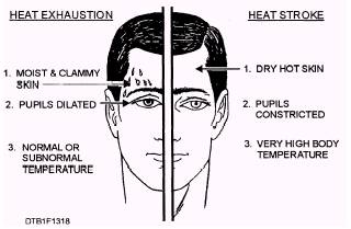 Figure 13-18.\Symptoms of heat exhaustion and heat stroke. When providing emergency treatment for heat stroke, keep in mind that if the casualty remains overheated, the more likely he/she will suffer irreversible body damage or death. Your main objective is to get the body temperature down as quickly as possible. Move the casualty to the coolest possible place, and remove as much clothing as possible. Body heat can be reduced quickly by immersing the casualty in a cold water bath. If that is not possible, give the casualty a sponge bath by applying wet, cold towels to the entire body. Or you can expose him/her to a fan or air conditioner. If cold packs are available, place them under the arms, around the neck, at the ankles, and in the groin. If the casualty is conscious, give him/her cool water to drink. Do not give any hot drinks or stimulants. Because of the seriousness of heat stroke, it is important to get the casualty to a medical facility as soon as possible. Continue the cooling measures during transportation. |