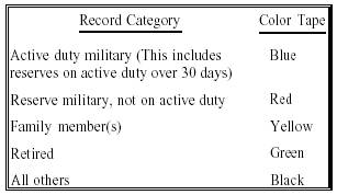 RECORD CATEGORY TAPE Immediately below the retirement year tape box is a similar box that should be used to indicate the record category. Use 1/2-inch wide, bright-colored tape in strips approximately l-inch long. Attach the tape in the space provided and extend the tape around the edge of the jacket to the back. All dental records should be identified with colored tape in the "RECORD CATEGORY TAPE" box, according to the following categories listed below: