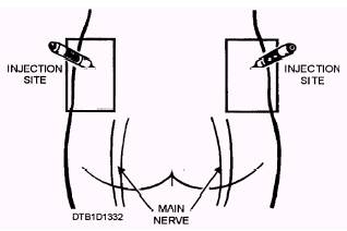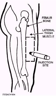 Figure 13-31.\Thigh injection site. needle end of the atropine injector against the injection site and apply firm, even pressure (not jabbing motion) to the injector until it pushes the needle into your thigh (or buttocks). Make sure you do not hit any buttons or other objects. Using a jabbing motion may result in an improper injection or injury to the thigh or buttocks.