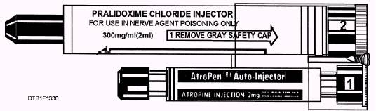 PREVENTION AND TREATMENT OF NERVE AGENT POISONING The essential prevention and treatment of nerve agent poisoning include the following actions: Donning the protective mask and hood at the first indication of a nerve agent attack. Administering atropine and pralidoxime chloride (2 PAM Cl) as soon as any symptoms are noted. Administering convulsant antidote for nerve agents (CANA) to moderately or to severely poisoned casualties. CANA is also referred to as diazepam. Removing or neutralizing any liquid contamination immediately. Removing airway secretions if they are obstructing the airway. Airway suction may be needed. Establishing a patient airway (for example, with a cricothyroidotomy or endotracheal tube) and administering assisted ventilation, if required. Only qualified personnel can perform these procedures. You should use oxygen if available. NERVE AGENT ANTIDOTES Atropine sulfate and 2 PAM Cl remain essential drugs in the treatment of nerve agent poisoning. When exposed, each member of the Navy and Marine Corps is issued three 2 mg auto injectors of atropine and three 600 mg auto injectors of 2 PAM Cl (fig. 13-30). Do not give nerve agent antidotes for preventive purposes before contemplated exposure to a nerve agent. The atropine auto injector consists of a hard plastic tube containing 2 mg (0.7 ml) of atropine in solution. It has a pressure activated coiled spring mechanism that triggers the needle for injection of the antidote solution. The 2 PAM Cl auto injector is a hard plastic tube, which dispenses 600 mg of 2 PAM Cl (300 mg/ml) solution when activated. It also has a pressure activated coiled spring mechanism identical to that in the atropine auto injector. Diazepam (CANA) is administered as a single-dose 10 mg autoinjector. General Usage Principles for Nerve Agent Antidotes Certain general usage principles should be followed in the administration of nerve agent antidotes. Complete instructions for the administration of nerve agent antidotes are found on the auto injectors and also in the Navy NAVMED P-5041. SELF-AID.\If you experience most or all of the mild symptoms of nerve agent poisoning, you should IMMEDIATELY hold your breath (without first inhaling) and put on your protective mask. Then, administer one set of (atropine and 2 PAM Cl) injections into your lateral thigh muscle or buttocks as illustrated in figures 13-31 and 13-32. Position the
