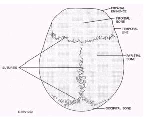 Figure 3-1.\Structure of a typical flat bone. brain, eyes, and ears. It can be divided into two parts: the cranium and the bones of the face. The cranium is primarily involved in housing and protecting the brain. The bones of the face are a complex framework that helps to form facial features, the upper jaw (maxilla) and lower jaw (mandible). With the exception of the mandible and the bones of the inner ear, all skull bones are joined together firmly along seams called sutures. An example of sutures is shown in figure 3-2. Sutures are sometimes considered immovable; however, they do permit a small amount of movement and provide mechanical protection for the brain by absorbing much of the force if a blow to the head occurs. The cranium is formed by eight cranial bones, which form the foundation for attachment of many of the muscles necessary for head movements and chewing. Figure 3-3 show the cranial bones, and Table 3-1 lists them as either single or paired bones. Frontal Bone The frontal bone forms the front part of the skull above the eyes, which includes the forehead and part of